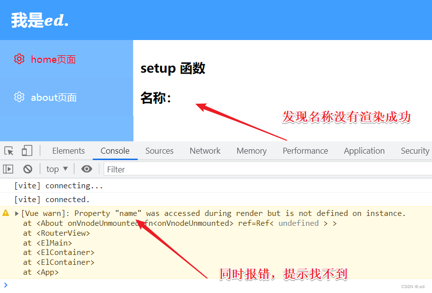 上面的代码编写完成,保存刷新页面,发现名称渲染出现问题,展示不出来,同时控制台报错告警。
