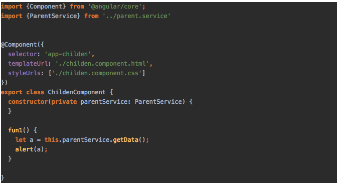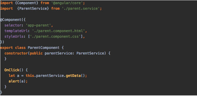 (1).这里我们定义了一个OnClick()方法,当页面点击事件触发,就会来调用parentService服务定义的方法getData()获取返回值,弹出返回值。