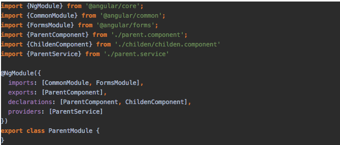我们这里把刚才创建的parentService服务依赖加进来,接着在provides中注册这个parentService服务,在ParentModule模块中注册之后,对于父组件和子组件来说都是指向同一个服务实例,而且这个服务的作用域只在当前这个模块中有效,这句话理解了,就等于理解了父子组件共享服务实现数据通信
