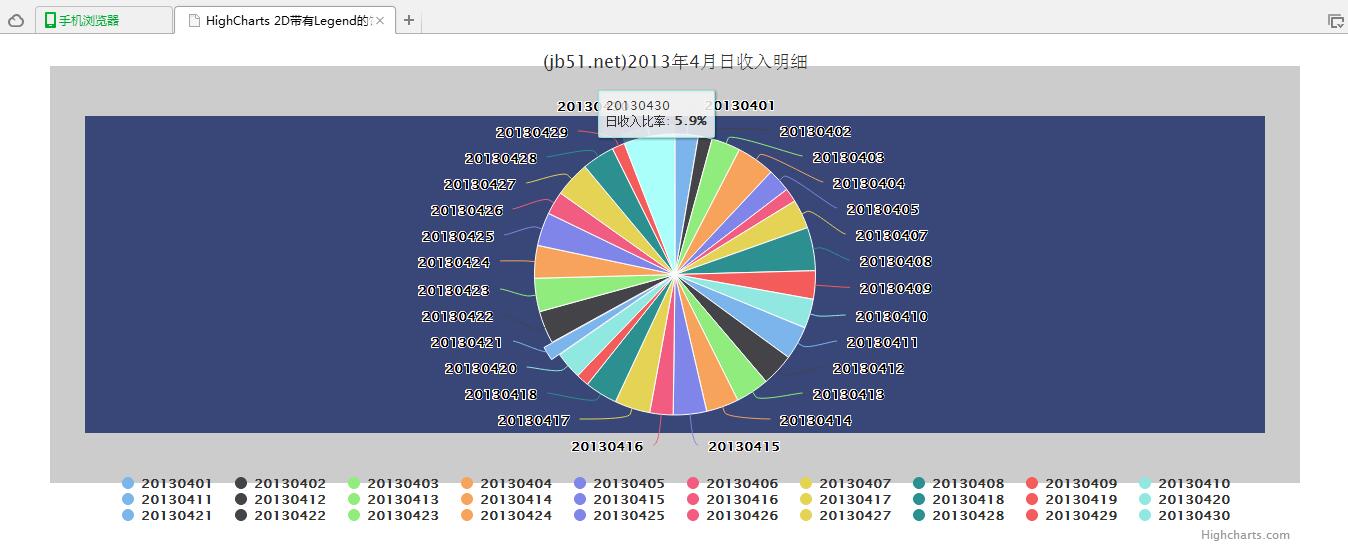 <!DOCTYPE html> <html> <head> <meta charset="UTF-8"> <title>HighCharts 2D带有Legend的饼图</title> <script type="text/javascript" src="js/jquery-1.7.2.min.js"></script> <script type="text/javascript" src="js/highcharts.js"></script> <script type="text/javascript"> $(function(){ // 构建饼图 $('#pieChart').highcharts({ chart: { plotBackgroundColor: '#384778', plotBorderWidth: '50px', plotShadow: true }, title: { text: '(jb51.net)2013年4月日收入明细' }, tooltip: { pointFormat: '{series.name}: <b>{point.percentage:.1f}%</b>' }, plotOptions: { pie: { allowPointSelect: true, cursor: 'pointer', dataLabels: { enabled: true }, showInLegend: true } }, series: [{ type: 'pie', name: '日收入比率', data: [ ['20130401', 45.0], ['20130402', 26.8], ['20130403', 56.3], ['20130404', 74.1], ['20130405', 45.0], ['20130406', 26.8], ['20130407', 56.4], ['20130408', 84.1], ['20130409', 55.0], ['20130410', 56.8], ['20130411', 64.8], ['20130412', 63.2], ['20130413', 64.8], ['20130414', 63.2], ['20130415', 64.8], ['20130416', 45.2], ['20130417', 68.8], ['20130418', 63.2], ['20130419', 24.8], ['20130420', 53.2], { name: '20130421', y: 27.8, sliced: true, selected: true }, ['20130422', 63.2], ['20130423', 64.8], ['20130424', 63.2], ['20130425', 64.8], ['20130426', 45.2], ['20130427', 68.8], ['20130428', 63.2], ['20130429', 24.8], ['20130430', 98.8] ] }] }); }); </script> </head> <body> <div id="pieChart" style="width: 1250px; height: 500px; margin: 0 auto"></div> </body> </html>
