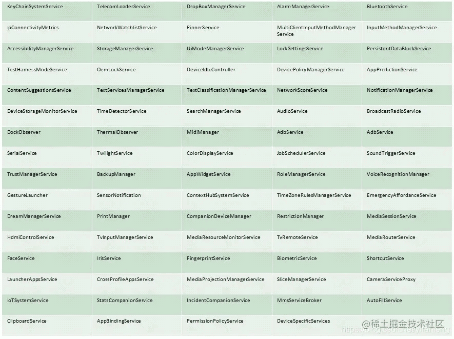 这个方法负责启动剩下的服务,共计有70多个,限于篇幅的原因,在此不再一一列举,贴一张从网上找到的图片大家简单的了解一下就行了: