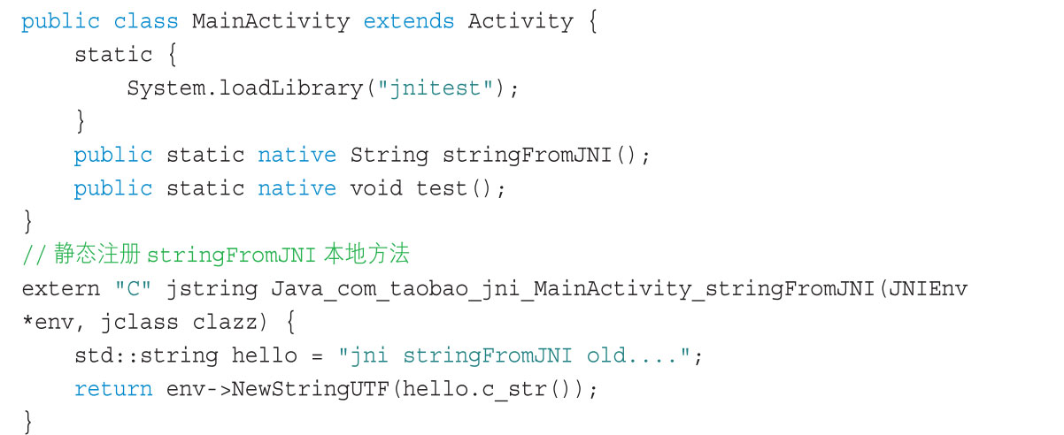 代码 图文的方式简述 so 库加载原理,下面的代码示例,stringFromJNI -> Java_com_taobao_jni_MainActivity_stringFromJNI 静态注册的 native 方 法,test->test 动态注册的 native 方法。