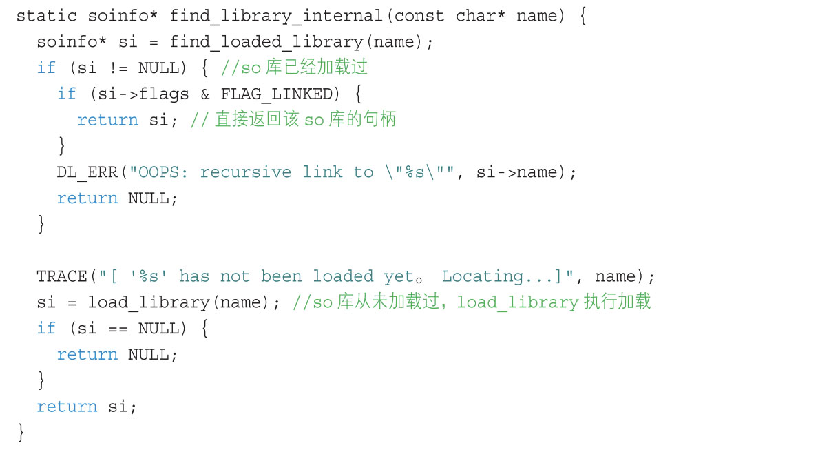 findloadedlibrary 方法判断 name 表示的 so库是否已经被加载过,如果加载过直接返回之前加载 so库的句柄,没有加载过,调用 load_library尝试加载 so库