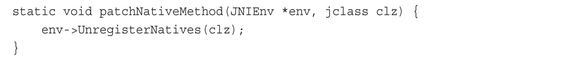 UnregisterNatives 函数会把 jclazz 所在类的所有 native 方法都重新指向为 dvmResolveNativeMethod,所以调用 UnregisterNatives 之后不管是静态注册还是动态注册的native方法之前是否执行过在加载补丁 so的时候都会重新去做映射。所以我们只需要以下调用。