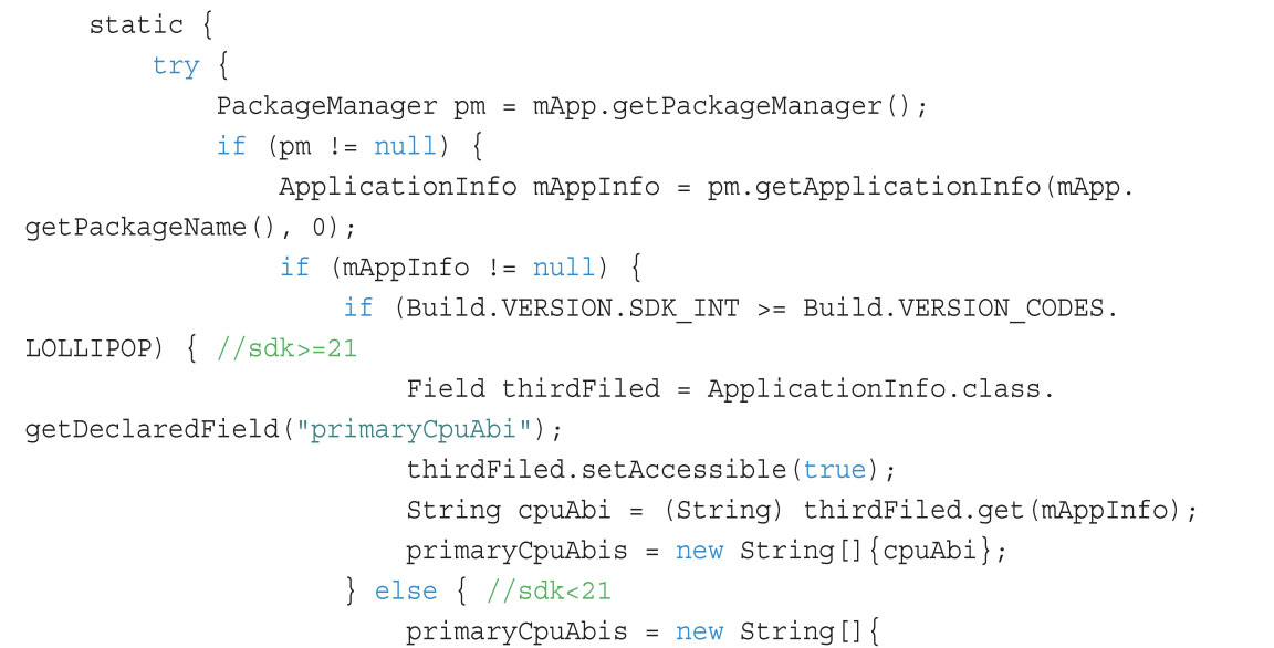 - sdk<21 时,由于此时不支持 64 位,所以直接把Build.CPU_ABI, Build.CPU_ABI2 作为 primaryCpuAbi 即可