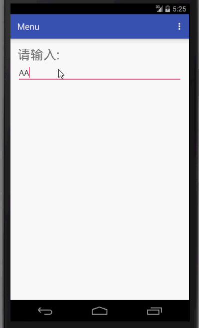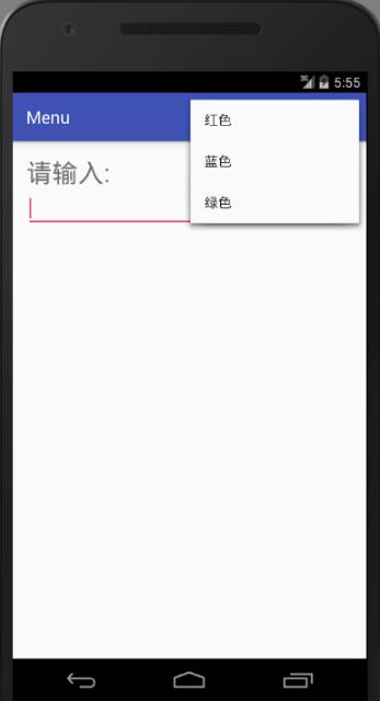 public class MainActivity extends AppCompatActivity { private EditText mEdt; private TextView mTv; @Override protected void onCreate(Bundle savedInstanceState) { super.onCreate(savedInstanceState); setContentView(R.layout.activity_main); mEdt = (EditText) findViewById(R.id.mEdt); mTv = (TextView) findViewById(R.id.mInput); } /** * 通过该方法添加菜单项或子菜单项 * @param menu * @return */ @Override public boolean onCreateOptionsMenu(Menu menu) { //方式一添加菜单布局 MenuInflater inflater = new MenuInflater(this); //将解析到的布局添加到menu中 inflater.inflate(R.menu.menu_main, menu); //方式二添加菜单布局 // getMenuInflater().inflate(R.menu.menu_main,menu); return super.onCreateOptionsMenu(menu); } /** * 设置菜单项的点击事件 * @param item * @return */ @Override public boolean onOptionsItemSelected(MenuItem item) { switch (item.getItemId()) { case R.id.menuColor: Toast.makeText(this, "你选择了修改颜色", Toast.LENGTH_SHORT).show(); break; case R.id.menuFont: Toast.makeText(this, "你选择了修改字体", Toast.LENGTH_SHORT).show(); break; } return super.onOptionsItemSelected(item); } }