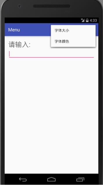 @Override public boolean onOptionsItemSelected(MenuItem item) { //先判断点击的是哪个id switch (item.getItemId()) { case R.id.font_10: mEdt.setTextSize(10 * 2); break; case R.id.font_12: mEdt.setTextSize(12 * 2); break; case R.id.font_14: mEdt.setTextSize(14 * 2); break; case R.id.font_16: mEdt.setTextSize(16 * 2); break; case R.id.font_18: mEdt.setTextSize(18 * 2); break; case R.id.blue: mEdt.setTextColor(Color.BLUE); break; case R.id.red: mEdt.setTextColor(Color.RED); break; case R.id.green: mEdt.setTextColor(Color.GREEN); break; } return super.onOptionsItemSelected(item); }