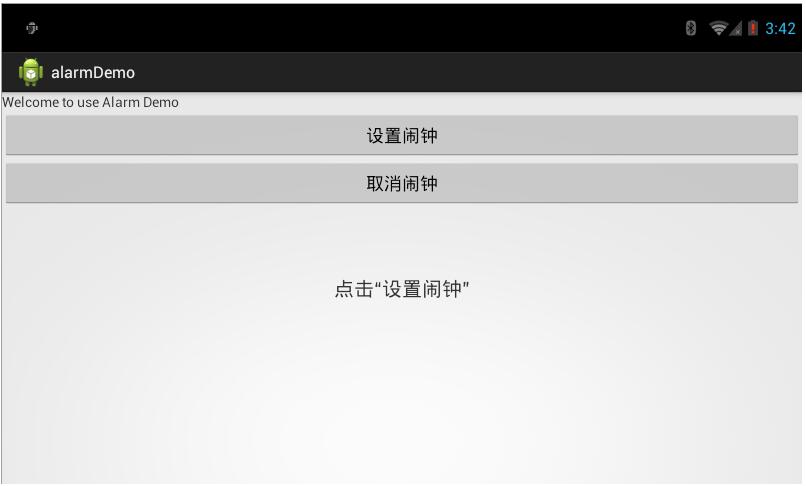 public class MainActivity extends Activity { private Button btnSet, btnCancel; private TextView info; private Calendar calendar; @Override protected void onCreate(Bundle savedInstanceState) { super.onCreate(savedInstanceState); setContentView(R.layout.activity_main); btnSet = (Button) findViewById(R.id.setalarm); btnCancel = (Button) findViewById(R.id.cancelalarm); info = (TextView) findViewById(R.id.info); calendar = Calendar.getInstance(); btnSet.setOnClickListener(new OnClickListener() { @Override public void onClick(View v) { // TODO Auto-generated method stub calendar.setTimeInMillis(System.currentTimeMillis()); int mHour = calendar.get(Calendar.HOUR_OF_DAY); int mMinute = calendar.get(Calendar.MINUTE); new TimePickerDialog(MainActivity.this, new TimePickerDialog.OnTimeSetListener() { @Override public void onTimeSet(TimePicker view, int hourOfDay, int minute) { // TODO Auto-generated method stub calendar.setTimeInMillis(System.currentTimeMillis()); calendar.set(Calendar.HOUR_OF_DAY, hourOfDay); calendar.set(Calendar.MINUTE, minute); calendar.set(Calendar.SECOND, 0); calendar.set(Calendar.MILLISECOND, 0); // 建立Intent和PendingIntent来调用目标组件 Intent intent = new Intent(MainActivity.this, AlarmReceiver.class); PendingIntent pendingIntent = PendingIntent.getBroadcast(MainActivity.this, 0, intent, 0); // 获取闹钟管理的实例 AlarmManager am = (AlarmManager) getSystemService(ALARM_SERVICE); // 设置闹钟 am.set(AlarmManager.RTC_WAKEUP, calendar.getTimeInMillis(), pendingIntent); // 设置周期闹钟 am.setRepeating(AlarmManager.RTC_WAKEUP, System.currentTimeMillis() (10 * 1000), (24 * 60 * 60 * 1000), pendingIntent); String tmpS = "设置闹钟时间为" format(hourOfDay) ":" format(minute); info.setText(tmpS); } }, mHour, mMinute, true).show(); } }); btnCancel.setOnClickListener(new OnClickListener() { @Override public void onClick(View v) { // TODO Auto-generated method stub Intent intent = new Intent(MainActivity.this, AlarmReceiver.class); PendingIntent pendingIntent = PendingIntent.getBroadcast( MainActivity.this, 0, intent, 0); // 获取闹钟管理实例 AlarmManager am = (AlarmManager) getSystemService(ALARM_SERVICE); // 取消 am.cancel(pendingIntent); info.setText("闹钟已经取消"); } }); } // 格式化字符串7:3-->07:03 private String format(int x) { String s = "" x; if (s.length() == 1) { s = "0" s; } return s; } @Override public boolean onCreateOptionsMenu(Menu menu) { // Inflate the menu; this adds items to the action bar if it is present. getMenuInflater().inflate(R.menu.activity_main, menu); return true; } }