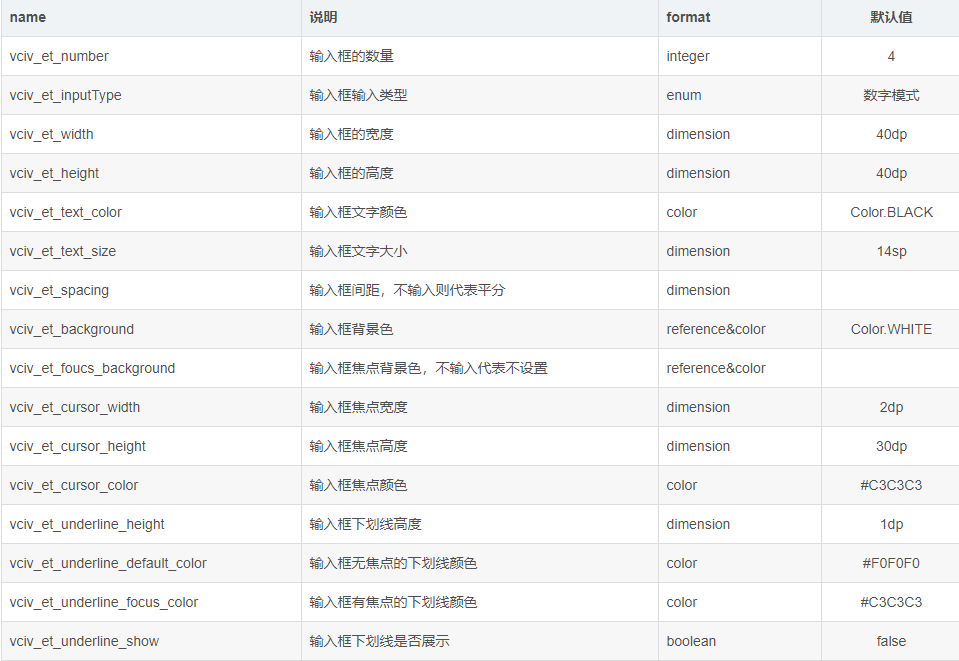 <com.wynsbin.vciv.VerificationCodeInputView android:id="@ id/vciv_code" android:layout_width="match_parent" android:layout_height="wrap_content" android:layout_marginTop="48dp" android:gravity="center" android:orientation="horizontal" app:vciv_et_background="@android:color/white" app:vciv_et_foucs_background="@android:color/holo_orange_dark" app:vciv_et_cursor_color="@color/colorPrimary" app:vciv_et_height="58dp" app:vciv_et_inputType="number" app:vciv_et_number="6" app:vciv_et_text_color="@android:color/black" app:vciv_et_text_size="18sp" app:vciv_et_underline_default_color="@android:color/holo_green_dark" app:vciv_et_underline_focus_color="@android:color/holo_blue_bright" app:vciv_et_underline_height="2dp" app:vciv_et_underline_show="true" app:vciv_et_width="58dp" />