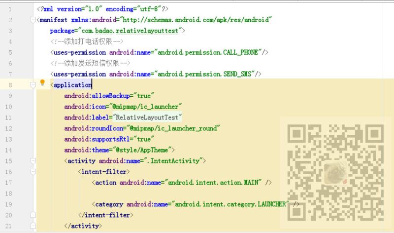 因为用到了打电话和发动短信,所以需要声明这两个权限,打开AndroidMainfest.xml