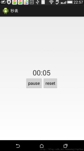 package com.example.second; import android.os.Bundle; import android.os.Handler; import android.os.Message; import android.app.Activity; import android.view.Menu; import android.view.View; import android.view.View.OnClickListener; import android.widget.Button; import android.widget.TextView; public class MainActivity extends Activity { private TextView mint; private TextView sec; private Button start; private Button reset; private long timeusedinsec; private boolean isstop = false; private Handler mHandler = new Handler() { /* * edit by yuanjingchao 2014-08-04 19:10 */ @Override public void handleMessage(Message msg) { // TODO Auto-generated method stub super.handleMessage(msg); switch (msg.what) { case 1: // 添加更新ui的代码 if (!isstop) { updateView(); mHandler.sendEmptyMessageDelayed(1, 1000); } break; case 0: break; } } }; @Override protected void onCreate(Bundle savedInstanceState) { super.onCreate(savedInstanceState); setContentView(R.layout.activity_main); initViews(); } private void initViews() { mint = (TextView) findViewById(R.id.mint); sec = (TextView) findViewById(R.id.sec); reset = (Button) findViewById(R.id.reset); start = (Button) findViewById(R.id.start); reset.setOnClickListener(new OnClickListener() { @Override public void onClick(View arg0) { // TODO Auto-generated method stub mint.setText("00"); sec.setText("00"); start.setText("start"); timeusedinsec=0; isstop=true; } }); start.setOnClickListener(new OnClickListener() { @Override public void onClick(View arg0) { // TODO Auto-generated method stub mHandler.removeMessages(1); String aaa=start.getText().toString(); if(aaa.equals("start")){ mHandler.sendEmptyMessage(1); isstop = false; start.setText("pause"); }else { mHandler.sendEmptyMessage(0); isstop = true; start.setText("start"); } } }); } private void updateView() { timeusedinsec = 1; int minute = (int) (timeusedinsec / 60)`; int second = (int) (timeusedinsec % 60); if (minute < 10) mint.setText("0" minute); else mint.setText("" minute); if (second < 10) sec.setText("0" second); else sec.setText("" second); } }