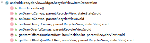 编写一个MyDecoration类,继承RecyclerView.ItemDecoration类,Ctrl O,发现除去已弃用的方法和构造方法,ItemDecoration类主要有三个方法: