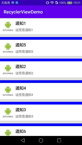 //添加自定义分割线 class MyDecoration extends RecyclerView.ItemDecoration { @Override public void getItemOffsets(@NonNull Rect outRect, @NonNull View view, @NonNull RecyclerView parent, @NonNull RecyclerView.State state) { super.getItemOffsets(outRect, view, parent, state); //设置间距 outRect.bottom = 10; } @Override public void onDraw(@NonNull Canvas c, @NonNull RecyclerView parent, @NonNull RecyclerView.State state) { super.onDraw(c, parent, state); Paint paint = new Paint(); paint.setColor(Color.BLUE); //获取item的数量 int count = parent.getChildCount(); //设置要绘制的矩形的left、right、top、bottom值 int left = parent.getPaddingLeft(); int right = parent.getWidth() - parent.getPaddingRight(); for (int i = 0; i < count; i ){ //获取对应的item View view = parent.getChildAt(i); float top = view.getBottom(); float bottom = view.getBottom() 10; //绘制矩形 c.drawRect(left,top,right,bottom,paint); } } } recyclerView.addItemDecoration(new MyDecoration());