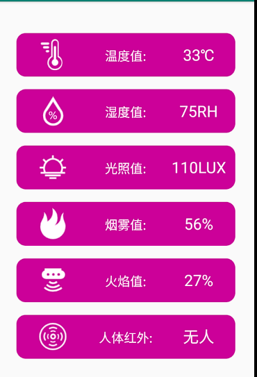 <?xml version="1.0" encoding="utf-8"?> <layout xmlns:android="http://schemas.android.com/apk/res/android" xmlns:app="http://schemas.android.com/apk/res-auto" xmlns:tools="http://schemas.android.com/tools"> <data> <variable name="viewmodel" type="com.franzliszt.refreshdata.viewmodel.ViewModel" /> </data> <LinearLayout android:layout_width="match_parent" android:layout_height="match_parent" android:orientation="vertical" tools:context=".view.MainActivity" android:layout_margin="30dp"> <LinearLayout android:layout_width="match_parent" android:layout_height="0dp" android:layout_weight="1" android:background="@drawable/item_bg_style" android:layout_marginTop="20dp" android:paddingTop="10dp"> <ImageView android:layout_width="0dp" android:layout_weight="1" android:layout_height="50dp" tmpImage="@{viewmodel.sensor.tmpImage}" android:scaleType="fitCenter"/> <TextView android:layout_width="0dp" android:layout_weight="1" android:layout_height="50dp" android:text="温度值:" android:textColor="#ffffff" android:textSize="20sp" android:gravity="center"/> <TextView android:layout_width="0dp" android:layout_weight="1" android:layout_height="50dp" android:text="@{viewmodel.sensor.tmpValue}" android:textColor="#ffffff" android:textSize="25sp" android:gravity="center"/> </LinearLayout> <LinearLayout android:layout_width="match_parent" android:layout_height="0dp" android:layout_weight="1" android:background="@drawable/item_bg_style" android:layout_marginTop="20dp" android:paddingTop="10dp"> <ImageView android:layout_width="0dp" android:layout_weight="1" android:layout_height="50dp" humImage="@{viewmodel.sensor.humImage}" android:scaleType="fitCenter"/> <TextView android:layout_width="0dp" android:layout_weight="1" android:layout_height="50dp" android:text="湿度值:" android:textColor="#ffffff" android:textSize="20sp" android:gravity="center"/> <TextView android:layout_width="0dp" android:layout_weight="1" android:layout_height="50dp" android:text="@{viewmodel.sensor.humValue}" android:textColor="#ffffff" android:textSize="25sp" android:gravity="center"/> </LinearLayout> <LinearLayout android:layout_width="match_parent" android:layout_height="0dp" android:layout_weight="1" android:background="@drawable/item_bg_style" android:layout_marginTop="20dp" android:paddingTop="10dp"> <ImageView android:layout_width="0dp" android:layout_weight="1" android:layout_height="50dp" lightImage="@{viewmodel.sensor.lightImage}" android:scaleType="fitCenter"/> <TextView android:layout_width="0dp" android:layout_weight="1" android:layout_height="50dp" android:text="光照值:" android:textColor="#ffffff" android:textSize="20sp" android:gravity="center"/> <TextView android:layout_width="0dp" android:layout_weight="1" android:layout_height="50dp" android:text="@{viewmodel.sensor.lightValue}" android:textColor="#ffffff" android:textSize="25sp" android:gravity="center"/> </LinearLayout> <LinearLayout android:layout_width="match_parent" android:layout_height="0dp" android:layout_weight="1" android:background="@drawable/item_bg_style" android:layout_marginTop="20dp" android:paddingTop="10dp"> <ImageView android:layout_width="0dp" android:layout_weight="1" android:layout_height="50dp" smokeImage="@{viewmodel.sensor.smokeImage}" android:scaleType="fitCenter"/> <TextView android:layout_width="0dp" android:layout_weight="1" android:layout_height="50dp" android:text="烟雾值:" android:textColor="#ffffff" android:textSize="20sp" android:gravity="center"/> <TextView android:layout_width="0dp" android:layout_weight="1" android:layout_height="50dp" android:text="@{viewmodel.sensor.smokeValue}" android:textColor="#ffffff" android:textSize="25sp" android:gravity="center"/> </LinearLayout> <LinearLayout android:layout_width="match_parent" android:layout_height="0dp" android:layout_weight="1" android:background="@drawable/item_bg_style" android:layout_marginTop="20dp" android:paddingTop="10dp"> <ImageView android:layout_width="0dp" android:layout_weight="1" android:layout_height="50dp" fireImage="@{viewmodel.sensor.fireImage}" android:scaleType="fitCenter"/> <TextView android:layout_width="0dp" android:layout_weight="1" android:layout_height="50dp" android:text="火焰值:" android:textColor="#ffffff" android:textSize="20sp" android:gravity="center"/> <TextView android:layout_width="0dp" android:layout_weight="1" android:layout_height="50dp" android:text="@{viewmodel.sensor.fireValue}" android:textColor="#ffffff" android:textSize="25sp" android:gravity="center"/> </LinearLayout> <LinearLayout android:layout_width="match_parent" android:layout_height="0dp" android:layout_weight="1" android:background="@drawable/item_bg_style" android:layout_marginTop="20dp" android:paddingTop="10dp"> <ImageView android:layout_width="0dp" android:layout_weight="1" android:layout_height="50dp" humanImage="@{viewmodel.sensor.humanImage}" android:scaleType="fitCenter"/> <TextView android:layout_width="0dp" android:layout_weight="1" android:layout_height="50dp" android:text="人体红外:" android:textColor="#ffffff" android:textSize="20sp" android:gravity="center"/> <TextView android:layout_width="0dp" android:layout_weight="1" android:layout_height="50dp" android:text="@{viewmodel.sensor.humanValue}" android:textColor="#ffffff" android:textSize="25sp" android:gravity="center"/> </LinearLayout> </LinearLayout> </layout>