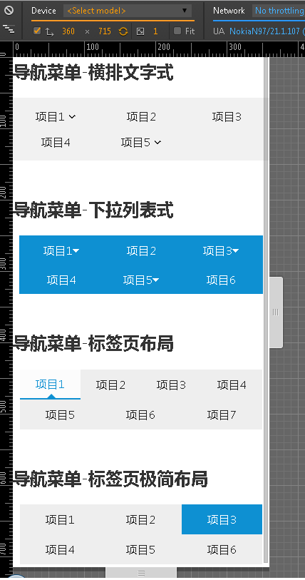 <h1>导航菜单-标签页布局</h1> <div data-am-widget="tabs" class="am-tabs am-tabs-d2"> <ul class="am-tabs-nav"> <li class="am-active"><a href="#">项目1</a></li> <li><a href="#">项目2</a></li> <li><a href="#">项目3</a></li> <li><a href="#">项目4</a></li> </ul> <ul class="am-tabs-nav"> <li><a href="#">项目5</a></li> <li><a href="#">项目6</a></li> <li><a href="#">项目7</a></li> </ul> </div>