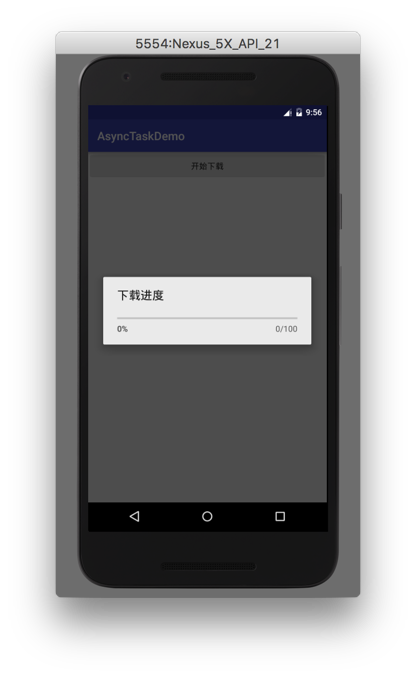 我们看到了onPreExecute()被调用了,证明它确实是在执行后台任务之前调用了,且是在主线程调用。此时我们执行了实例代码中的进度条显示框的显示操作,此时的界面如下