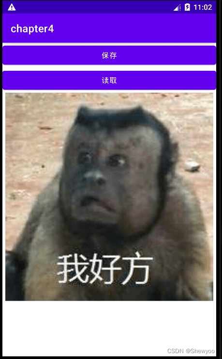 public class ImageWriteActivity extends AppCompatActivity implements View.OnClickListener { private ImageView iv_content; private String path; @Override protected void onCreate(Bundle savedInstanceState) { super.onCreate(savedInstanceState); setContentView(R.layout.activity_image_write); iv_content = findViewById(R.id.iv_content); findViewById(R.id.btn_save).setOnClickListener(this); findViewById(R.id.btn_read).setOnClickListener(this); } @Override public void onClick(View view) { switch (view.getId()){ case R.id.btn_save: String fileName = System.currentTimeMillis() ".jpeg"; // 获取当前APP的私有下载目录 path = getExternalFilesDir(Environment.DIRECTORY_DOWNLOADS).toString() File.separatorChar fileName; // 从指定的资源文件中获取位图对象 Bitmap b1 = BitmapFactory.decodeResource(getResources(),R.drawable.thing1); // 把位图对象保存为图片文件 FileUtil.saveImage(path,b1); Toast.makeText(this,"保存成功",Toast.LENGTH_SHORT).show(); break; case R.id.btn_read: Bitmap b2 = FileUtil.openImage(path); iv_content.setImageBitmap(b2); break; } } }
