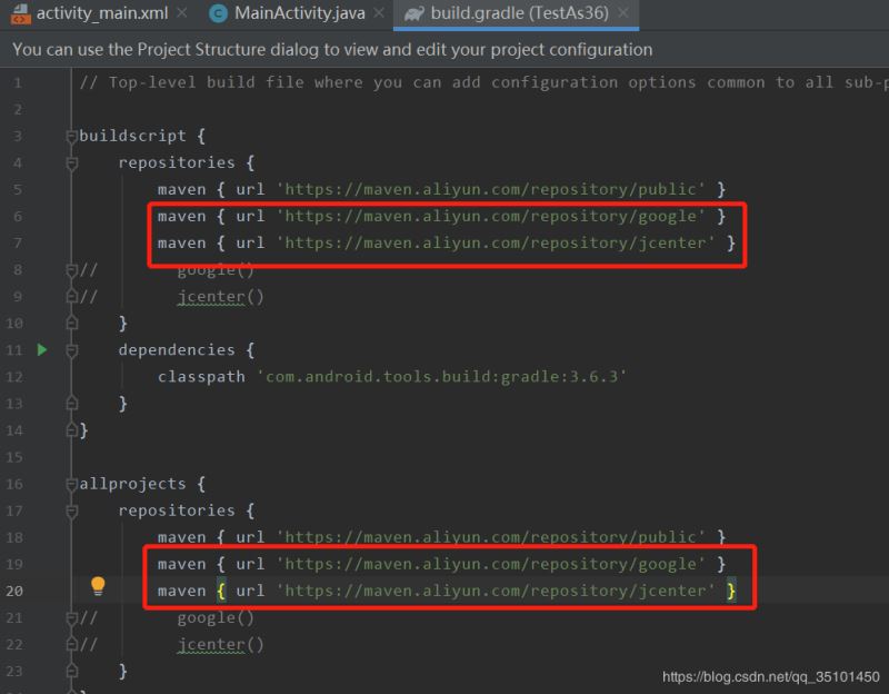 buildscript { repositories { maven { url 'https://maven.aliyun.com/repository/public' } google() jcenter() } dependencies { classpath 'com.android.tools.build:gradle:3.6.3' } } allprojects { repositories { maven { url 'https://maven.aliyun.com/repository/public' } google() jcenter() } }