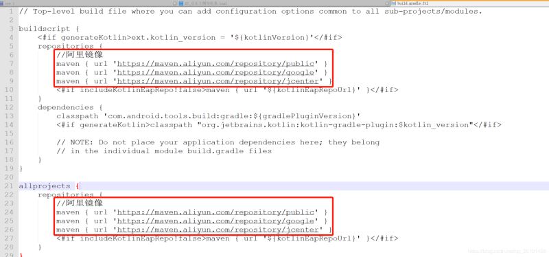 第一步:如下所示,在项目的build.gradle的两个repositories中添加阿里public镜像,最好放在google() 前面: