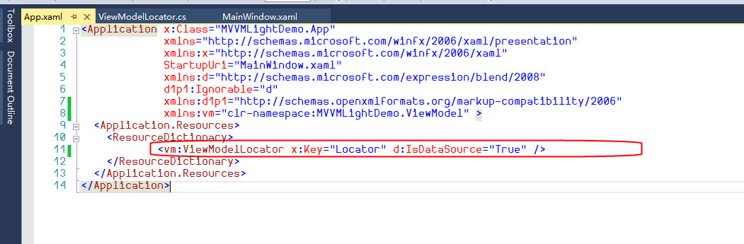 <Application x:Class="MVVMLightDemo.App" xmlns="http://schemas.microsoft.com/winfx/2006/xaml/presentation" xmlns:x="http://schemas.microsoft.com/winfx/2006/xaml" StartupUri="View/WelcomeView.xaml" xmlns:d="http://schemas.microsoft.com/expression/blend/2008" d1p1:Ignorable="d" xmlns:d1p1="http://schemas.openxmlformats.org/markup-compatibility/2006" xmlns:vm="clr-namespace:MVVMLightDemo.ViewModel" > <Application.Resources> <ResourceDictionary> <vm:ViewModelLocator x:Key="Locator" d:IsDataSource="True" /> </ResourceDictionary> </Application.Resources> </Application>