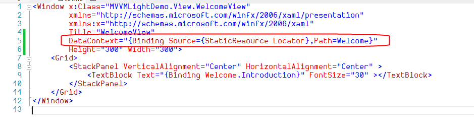 DataContext="{Binding Source={StaticResource Locator},Path=Welcome}"