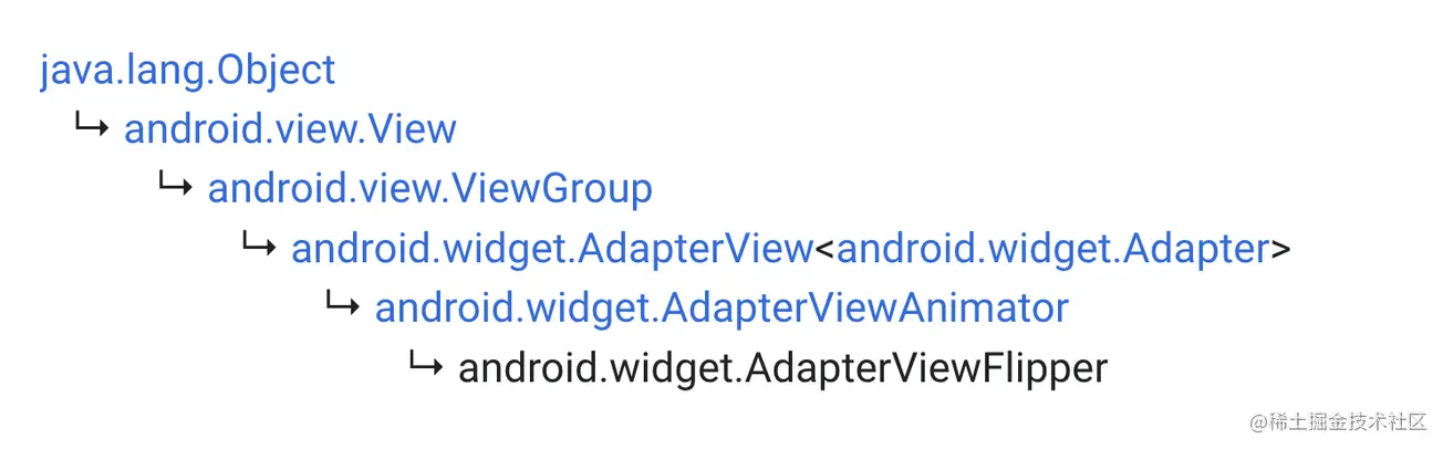 从继承关系可以看出AdapterViewFlipper同ListView类似,都继承了AdapterView,所以AdapterViewFlipper可以像ListView一样使用数据适配器来填充数据。
