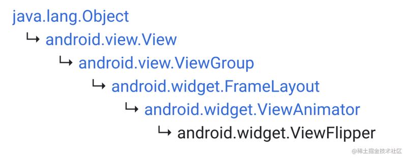 可以看出ViewFlipper继承自ViewAnimator,ViewAnimator可以将在添加到其中的两个或多个子View之间进行动画处理的简单。一次只显示子View。可以定期在每个子View之间自动翻转。