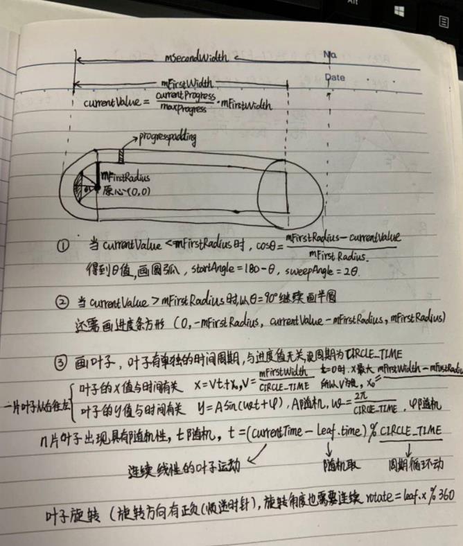public class ProgressView extends View { //前景颜色 private int FIRST_COLOR = 0xffFEA711; // 0xff00574B;// //背景颜色 private int SECOND_COLOR = 0xffFBE39C; private int mSecondWidth; private int mFirstWidth; private int mHeight; private int mSecondRadius; private int mFirstRadius; private int progressPadding = 30; private float currentValue; private int maxProgress = 100; //画笔 private Paint paint; private RectF rectF; private Bitmap leafBitmap; private int mLeafWidth; private int mLeafHeight; private List<Leaf> mLeafInfos; public ProgressView(Context context) { super(context, null); } public ProgressView(Context context, @Nullable AttributeSet attrs) { this(context, attrs, 0); } public ProgressView(Context context, @Nullable AttributeSet attrs, int defStyleAttr) { super(context, attrs, defStyleAttr); paint = new Paint(); paint.setStyle(Paint.Style.FILL); paint.setColor(FIRST_COLOR); paint.setAntiAlias(true); rectF = new RectF(); leafBitmap = BitmapFactory.decodeResource(context.getResources(), R.mipmap.icon_leaf); mLeafWidth = leafBitmap.getWidth(); mLeafHeight = leafBitmap.getHeight(); Log.e("zhen", " mLeafWidth: " mLeafWidth " mLeafHeight: " mLeafHeight); } @Override protected void onSizeChanged(int w, int h, int oldw, int oldh) { super.onSizeChanged(w, h, oldw, oldh); mHeight = h; //外围 mSecondWidth = w; mSecondRadius = (int) ((mSecondWidth * 1f / 5) / 2); //内部进度条 mFirstWidth = mSecondWidth - progressPadding - mSecondRadius; mFirstRadius = mSecondRadius - progressPadding; mLeafInfos = new LeafFactory(mFirstRadius - mLeafWidth, 6).generateLeafs(); Log.e("zhen", " mSecondWidth: " mSecondWidth " mHeight: " mHeight " mSecondRadius: " mSecondRadius " mFirstWidth: " mFirstWidth " mFirstRadius: " mFirstRadius); } public void setCurrentProgress(float currentProgress) { Log.e("zhen", "currentProgress: " currentProgress); if (currentProgress > 100) return; currentValue = currentProgress / maxProgress * mFirstWidth; invalidate(); } @Override protected void onDraw(Canvas canvas) { super.onDraw(canvas); //画布移动 canvas.translate(mSecondRadius, mHeight / 2); //画背景左半圆 paint.setStyle(Paint.Style.FILL); paint.setColor(SECOND_COLOR); rectF.left = -mSecondRadius; rectF.top = -mSecondRadius; rectF.right = mSecondRadius; rectF.bottom = mSecondRadius; canvas.drawArc(rectF, 90, 180, false, paint); //画背景右半圆 rectF.left = mSecondWidth - 3 * mSecondRadius; rectF.top = -mSecondRadius; rectF.right = mSecondWidth - mSecondRadius; rectF.bottom = mSecondRadius; canvas.drawArc(rectF, -90, 180, false, paint); //画背景中间方形 rectF.left = 0; rectF.top = -mSecondRadius; rectF.right = mSecondWidth - 2 * mSecondRadius; rectF.bottom = mSecondRadius; canvas.drawRect(rectF, paint); //绘制进度条半圆 paint.setColor(FIRST_COLOR); float leftValue = (mFirstRadius - currentValue) > 0 ? (mFirstRadius - currentValue) : 0; float angel = (float) Math.toDegrees(Math.acos(leftValue / mFirstRadius)); rectF.left = -mFirstRadius; rectF.top = -mFirstRadius; rectF.right = mFirstRadius; rectF.bottom = mFirstRadius; canvas.drawArc(rectF, 180 - angel, 2 * angel, false, paint); //绘制进度条方形 if (currentValue >= mFirstRadius) { currentValue = currentValue > mFirstWidth ? mFirstWidth : currentValue; rectF.left = 0; rectF.top = -mFirstRadius; rectF.right = currentValue - mFirstRadius; rectF.bottom = mFirstRadius; canvas.drawRect(rectF, paint); } //落叶纷飞 if (currentValue > 0 && currentValue < mFirstWidth) { long currentTime = System.currentTimeMillis(); for (int i = 0; i < mLeafInfos.size(); i ) { Leaf leaf = mLeafInfos.get(i); int delay = (int) ((currentTime - leaf.startTime) % CIRCLE_TIME); leaf.x = mFirstWidth - mFirstRadius - delay * (mFirstWidth * 1f / CIRCLE_TIME); if (leaf.x mFirstRadius mLeafWidth < currentValue) continue; leaf.y = (float) (leaf.amplitude * Math.sin(2 * Math.PI / CIRCLE_TIME * delay leaf.phaseOffeset)); Log.e("zhen", "延时ms数" delay " 角速度: " (2 * Math.PI / CIRCLE_TIME) " leaf.x: " leaf.x " leaf.y: " leaf.y); // 通过Matrix控制叶子旋转 Matrix matrix = new Matrix(); matrix.postTranslate(leaf.x, leaf.y); // 根据叶子旋转方向确定叶子旋转角度 float rotate = leaf.rotateOrientation ? leaf.x % 360f : -leaf.x % 360; matrix.postRotate(rotate, leaf.x mLeafWidth / 2, leaf.y mLeafHeight / 2); Log.e("zhen", "落叶子旋转角度: " rotate); canvas.drawBitmap(leafBitmap, matrix, paint); } } //绘制旋转风车 paint.setColor(Color.WHITE); paint.setStyle(Paint.Style.STROKE); paint.setStrokeWidth(10); float x = mSecondWidth - 2 * mSecondRadius; float y = 0; canvas.drawCircle(x, y, mSecondRadius, paint); paint.setStyle(Paint.Style.FILL); paint.setColor(0XFFFCD158); canvas.drawCircle(x, y, mSecondRadius - 5, paint); } @IntDef({Amplitude.SMALL, Amplitude.MIDDLE, Amplitude.LARGE}) public @interface Amplitude { int SMALL = 0; int MIDDLE = 1; int LARGE = 2; } public static class Leaf { public static long CIRCLE_TIME = 3000; //一个周期所需要的时间 //振幅大小 private int amplitude; //初始相位偏移 private int phaseOffeset; //旋转方向 private boolean rotateOrientation; //延时时间 private long startTime; //x位置取决于初始位置偏移 private float x; //y位置取决于振幅,初始相位 private float y; @Override public String toString() { return "Leaf{" "amplitude=" amplitude ", phaseOffeset=" phaseOffeset ", rotateOrientation=" rotateOrientation ", startTime=" startTime ", x=" x ", y=" y '}'; } } public static class LeafFactory { private Random random = new Random(); int randomValue; private int mHeight; private int mLeafSize; public LeafFactory(int mHeight, int mLeafSize) { this.mHeight = mHeight; this.mLeafSize = mLeafSize; } public List<Leaf> generateLeafs() { List<Leaf> mLeafsInfo = new ArrayList<>(); for (int i = 0; i < mLeafSize; i ) { mLeafsInfo.add(generateLeaf()); } return mLeafsInfo; } private Leaf generateLeaf() { Leaf leaf = new Leaf(); randomValue = random.nextInt(3); switch (randomV