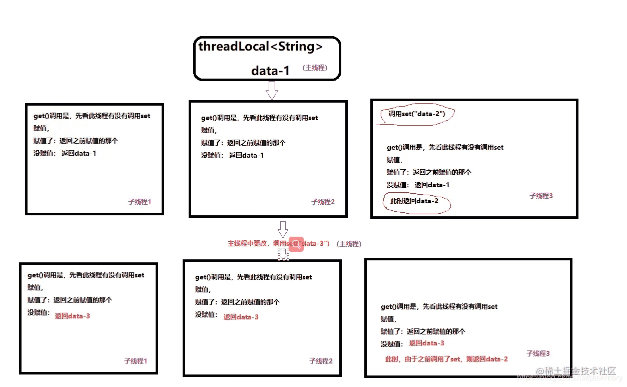 public static void main(String[] args) throws InterruptedException { ThreadLocal<String> threadLocal = new ThreadLocal<String>(){ @Override protected String initialValue() { return "data--1"; } }; System.out.println("1主线程--> " threadLocal.get()); Thread t1 = new Thread(()->{ }); t1.start(); threadLocal.set("data--2"); System.out.println("2主线程--> " threadLocal.get()); Thread t2 = new Thread(()->{ System.out.println("线程2---> " threadLocal.get()); }); t2.start(); Thread t3 = new Thread(()->{ threadLocal.set("data-->3"); System.out.println("线程3---> " threadLocal.get()); }); t3.start(); System.out.println("3主线程--> " threadLocal.get()); Thread.sleep(1000); }