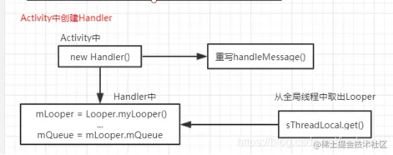//我们看到了enqueueMessage,我们看这个queue在哪里获取的 public Handler(Callback callback, boolean async) { if (FIND_POTENTIAL_LEAKS) { final Class<? extends Handler> klass = getClass(); if ((klass.isAnonymousClass() || klass.isMemberClass() || klass.isLocalClass()) && (klass.getModifiers() & Modifier.STATIC) == 0) { Log.w(TAG, "The following Handler class should be static or leaks might occur: " klass.getCanonicalName()); } } mLooper = Looper.myLooper(); if (mLooper == null) { throw new RuntimeException( "Can't create handler inside thread that has not called Looper.prepare()"); } mQueue = mLooper.mQueue; mCallback = callback; mAsynchronous = async; }