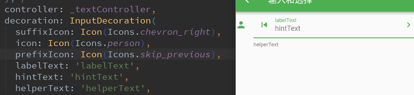 TextField( controller: accountController, decoration: InputDecoration( border: OutlineInputBorder(), hintText: '请输入账号', labelText: '左上角', prefixIcon: Icon(Icons.person), ), )