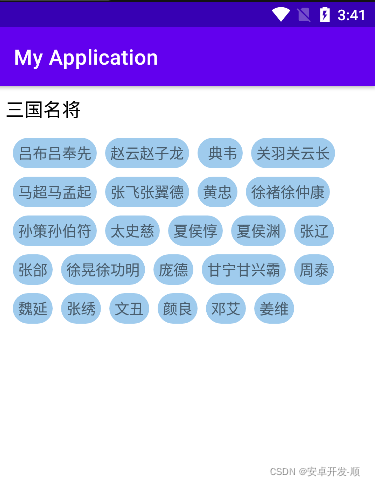 <?xml version="1.0" encoding="utf-8"?> <ScrollView xmlns:android="http://schemas.android.com/apk/res/android" android:layout_width="match_parent" android:layout_height="match_parent"> <LinearLayout android:layout_width="match_parent" android:layout_height="match_parent" android:orientation="vertical"> <TextView android:layout_marginTop="10dp" android:layout_width="wrap_content" android:layout_height="wrap_content" android:layout_marginLeft="@dimen/zs_flowlayout_title_marginL" android:text="三国名将" android:textColor="@android:color/black" android:textSize="18sp" /> <com.zs.test.customview.ZSFlowLayout android:id="@ id/activity_flow_flowlayout" android:layout_width="match_parent" android:layout_height="wrap_content" android:layout_margin="8dp" android:padding="7dp"> <TextView android:layout_width="wrap_content" android:layout_height="wrap_content" android:background="@drawable/shape_button_circular" android:text="吕布吕奉先" /> <TextView android:layout_width="wrap_content" android:layout_height="wrap_content" android:background="@drawable/shape_button_circular" android:text="赵云赵子龙" /> <TextView android:layout_width="wrap_content" android:layout_height="wrap_content" android:background="@drawable/shape_button_circular" android:paddingLeft="10dp" android:text="典韦" /> <TextView android:layout_width="wrap_content" android:layout_height="wrap_content" android:background="@drawable/shape_button_circular" android:text="关羽关云长" /> <TextView android:layout_width="wrap_content" android:layout_height="wrap_content" android:background="@drawable/shape_button_circular" android:text="马超马孟起" /> <TextView android:layout_width="wrap_content" android:layout_height="wrap_content" android:background="@drawable/shape_button_circular" android:text="张飞张翼德" /> <TextView android:layout_width="wrap_content" android:layout_height="wrap_content" android:background="@drawable/shape_button_circular" android:text="黄忠" /> <TextView android:layout_width="wrap_content" android:layout_height="wrap_content" android:background="@drawable/shape_button_circular" android:text="徐褚徐仲康" /> <TextView android:layout_width="wrap_content" android:layout_height="wrap_content" android:background="@drawable/shape_button_circular" android:text="孙策孙伯符" /> <TextView android:layout_width="wrap_content" android:layout_height="wrap_content" android:background="@drawable/shape_button_circular" android:text="太史慈" /> <TextView android:layout_width="wrap_content" android:layout_height="wrap_content" android:background="@drawable/shape_button_circular" android:text="夏侯惇" /> <TextView android:layout_width="wrap_content" android:layout_height="wrap_content" android:background="@drawable/shape_button_circular" android:text="夏侯渊" /> <TextView android:layout_width="wrap_content" android:layout_height="wrap_content" android:background="@drawable/shape_button_circular" android:text="张辽" /> <TextView android:layout_width="wrap_content" android:layout_height="wrap_content" android:background="@drawable/shape_button_circular" android:text="张郃" /> <TextView android:layout_width="wrap_content" android:layout_height="wrap_content" android:background="@drawable/shape_button_circular" android:text="徐晃徐功明" /> <TextView android:layout_width="wrap_content" android:layout_height="wrap_content" android:background="@drawable/shape_button_circular" android:text="庞德" /> <TextView android:layout_width="wrap_content" android:layout_height="wrap_content" android:background="@drawable/shape_button_circular" android:text="甘宁甘兴霸" /> <TextView android:layout_width="wrap_content" android:layout_height="wrap_content" android:background="@drawable/shape_button_circular" android:text="周泰" /> <TextView android:layout_width="wrap_content" android:layout_height="wrap_content" android:background="@drawable/shape_button_circular" android:text="魏延" /> <TextView android:layout_width="wrap_content" android:layout_height="wrap_content" android:background="@drawable/shape_button_circular" android:text="张绣" /> <TextView android:layout_width="wrap_content" android:layout_height="wrap_content" android:background="@drawable/shape_button_circular" android:text="文丑" /> <TextView android:layout_width="wrap_content" android:layout_height="wrap_content" android:background="@drawable/shape_button_circular" android:text="颜良" /> <TextView android:layout_width="wrap_content" android:layout_height="wrap_content" android:background="@drawable/shape_button_circular" android:text="邓艾" /> <TextView android:layout_width="wrap_content" android:layout_height="wrap_content" android:background="@drawable/shape_button_circular" android:text="姜维" /> </com.zs.test.customview.ZSFlowLayout> </LinearLayout> </ScrollView>
