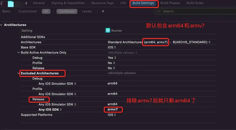 - 只选择保留必要的指令集类型。xcode 12以上默认是包含armv7和arm64位两种指令集。我们打Release包时可以排除armv7指令集。只保留arm64指令集就可以了 看图操作: