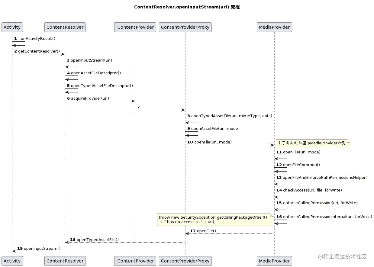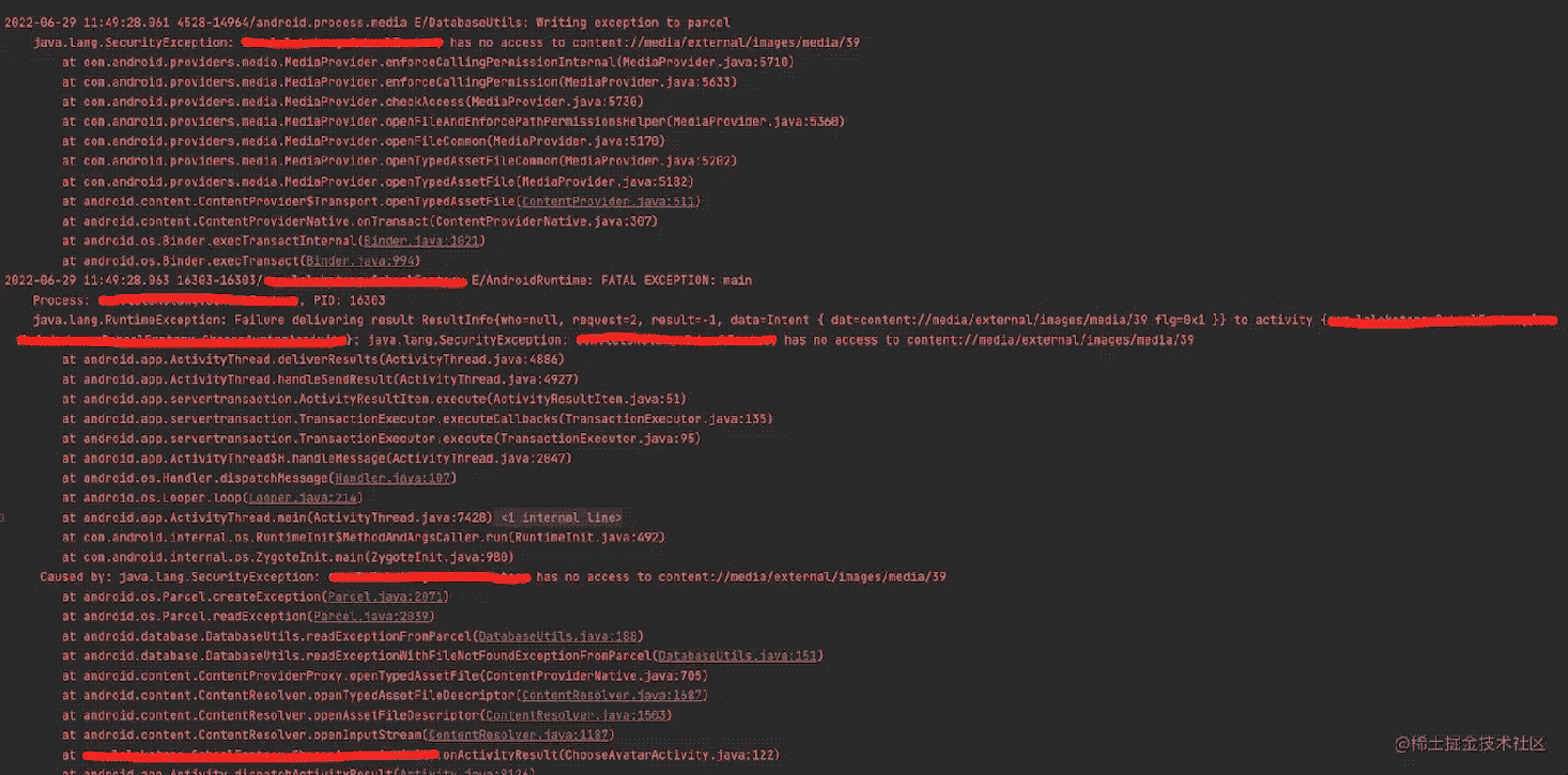 分析堆栈信息可以定位到,是调用者没有访问Uri的权限导致的异常,而我们自研图库在选图回传的时候是有设置FLAG_GRANT_READ_URI_PERMISSION,把URI的临时访问权限传递给调用者,且报错的堆栈打印是在第三方应用,所以可以初步判断问题应该是出自系统的权限授予过程。