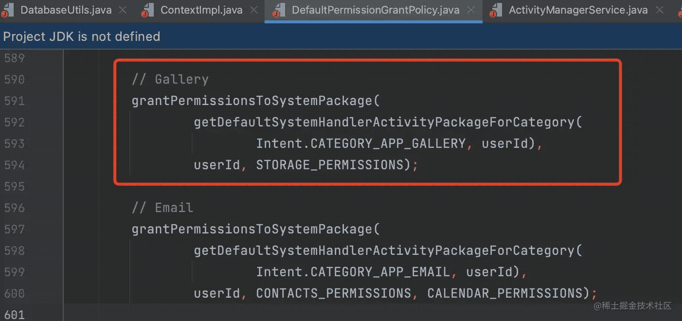 在这个方法里面可以看到它对图库进行默认授予存储权限的代码,具体是通过查找清单文件配置的category是Intent.CATEGORY_APP_GALLERY的应用。