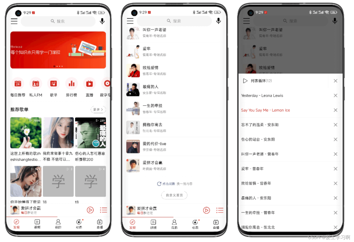效果图依次为发现界面顶部,包含首页轮播图,水平滚动的按钮,推荐歌单;然后是发现界面推荐单曲,点击单曲就是直接进入播放界面;最后是全局播放控制条上点击播放列表按钮显示的播放列表弹窗。