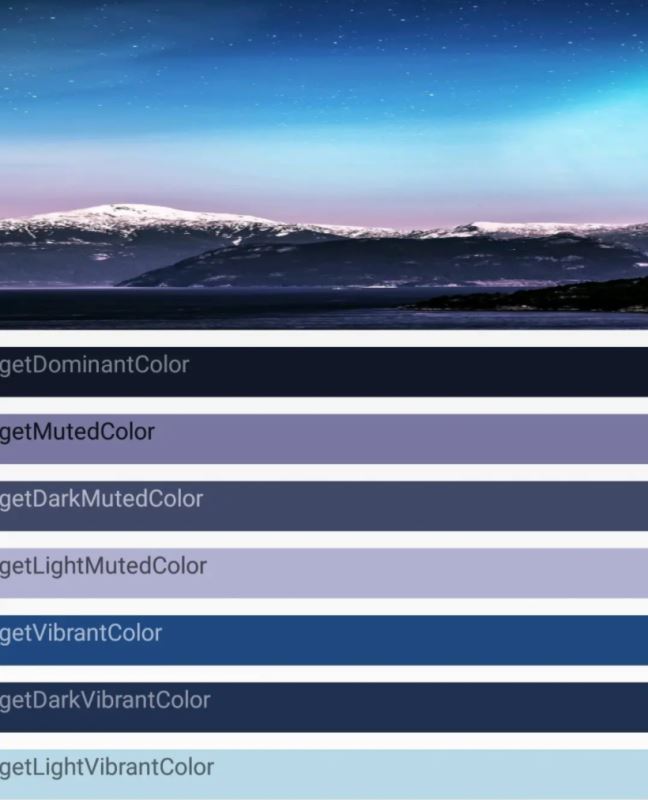 var bitmap = BitmapFactory.decodeResource(resources, R.mipmap.a) var builder = Palette.from(bitmap) var palette = builder.generate() color0.setBackgroundColor(palette.getDominantColor(Color.WHITE)) color1.setBackgroundColor(palette.getMutedColor(Color.WHITE)) color2.setBackgroundColor(palette.getDarkMutedColor(Color.WHITE)) color3.setBackgroundColor(palette.getLightMutedColor(Color.WHITE)) color4.setBackgroundColor(palette.getVibrantColor(Color.WHITE)) color5.setBackgroundColor(palette.getDarkVibrantColor(Color.WHITE)) color6.setBackgroundColor(palette.getLightVibrantColor(Color.WHITE))