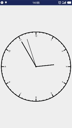 public class ClockView extends View{ private Paint circlePaint,dialPaint,numberPaint; //view 的宽高 private float mWidth,mHeight; //圆的半径 private float circleRadius; //圆心X,Y坐标 private float circleX,circleY; private int second,minute; private double hour; private Handler handler = new Handler(Looper.getMainLooper()){ @Override public void handleMessage(Message msg) { super.handleMessage(msg); if(msg.what==0){ invalidate(); } } }; public ClockView(Context context, AttributeSet attrs) { super(context, attrs); initPaint(); } private void initPaint(){ //刻盘圆,小时刻度,时针和分针的画笔 circlePaint = new Paint(Paint.ANTI_ALIAS_FLAG); circlePaint.setColor(Color.BLACK); circlePaint.setStyle(Paint.Style.STROKE); circlePaint.setStrokeWidth(10); //分钟刻度的画笔 dialPaint = new Paint(Paint.ANTI_ALIAS_FLAG); dialPaint.setColor(Color.BLACK); dialPaint.setStrokeWidth(5); //数字的画笔 numberPaint = new Paint(Paint.ANTI_ALIAS_FLAG); numberPaint.setColor(Color.BLACK); numberPaint.setStrokeWidth(5); numberPaint.setTextSize(30); } @Override protected void onMeasure(int widthMeasureSpec, int heightMeasureSpec) { super.onMeasure(widthMeasureSpec, heightMeasureSpec); mWidth = getMeasuredWidth(); mHeight = getMeasuredHeight(); if(mWidth<mHeight){ //圆的半径为view的宽度的一半再减9,防止贴边 circleRadius = mWidth/2-9; circleX = mWidth/2; circleY = mHeight/2; } else{ circleRadius = mHeight/2-9; circleX = mWidth/2; circleY = mHeight/2; } } @Override protected void onDraw(Canvas canvas) { super.onDraw(canvas); setTimes(); drawCirclePoint(canvas); drawCircle(canvas); drawDial(canvas); drawPointer(canvas); } /**圆心 * @param canvas */ private void drawCirclePoint(Canvas canvas){ canvas.drawCircle(circleX,circleY,5,circlePaint); } private void drawCircle(Canvas canvas){ canvas.drawCircle(circleX,circleY,circleRadius,circlePaint); } /**画刻度及时间 * @param canvas */ private void drawDial(Canvas canvas){ //时钟用长一点的刻度,画笔用画圆的画笔 Point hourStartPoint = new Point(circleX,circleY-circleRadius); Point hourEndPoint = new Point(circleX,circleY-circleRadius 40); //分钟的刻度要稍微短一些,画笔用画圆的画笔 Point startPoint2 = new Point(circleX,circleY-circleRadius); Point endPoint2 = new Point(circleX,circleY-circleRadius 10); //开始画刻度和数字,总共60个刻度,12个时钟刻度,被5整除画一个时钟刻度,被其余的为分针刻度 String clockNumber; for(int i=0;i<60;i ){ if(i%5==0){ if(i==0){ clockNumber = "12"; } else{ clockNumber = String.valueOf(i/5); } //时针刻度 canvas.drawLine(hourStartPoint.getX(),hourStartPoint.getY(),hourEndPoint.getX(),hourEndPoint.getY(),circlePaint); //画数字,需在时针刻度末端加30 canvas.drawText(clockNumber,circleX-numberPaint.measureText(clockNumber)/2,hourEndPoint.getY() 30,numberPaint); } else{ //画分针刻度 canvas.drawLine(startPoint2.getX(),startPoint2.getY(),endPoint2.getX(),endPoint2.getY(),circlePaint); } //画布旋转6度 canvas.rotate(360/60,circleX,circleY); } } /**画指针 * X点坐标 cos(弧度)*r * Y点坐标 sin(弧度)*r * toRadians将角度转成弧度 * 安卓坐标系与数学坐标系不同的地方是X轴是相反的,所以为了调整方向,需要将角度 270度 * @param canvas */ private void drawPointer(Canvas canvas){ canvas.translate(circleX,circleY); float hourX = (float) Math.cos(Math.toRadians(hour*30 270))*circleRadius*0.5f; float hourY = (float) Math.sin(Math.toRadians(hour*30 270))*circleRadius*0.5f; float minuteX = (float) Math.cos(Math.toRadians(minute*6 270))*circleRadius*0.8f; float minuteY = (float) Math.sin(Math.toRadians(minute*6 270))*circleRadius*0.8f; float secondX = (float) Math.cos(Math.toRadians(second*6 270))*circleRadius*0.8f; float secondY = (float) Math.sin(Math.toRadians(second*6 270))*circleRadius*0.8f; canvas.drawLine(0,0,hourX,hourY,circlePaint); canvas.drawLine(0,0,minuteX,minuteY,circlePaint); canvas.drawLine(0,0,secondX,secondY,dialPaint); //一秒重绘一次 handler.sendEmptyMessageDelayed(0,1000); } public void startClock(){ setTimes(); invalidate(); } private void setTimes(){ Date date = new Date(); Calendar calendar = Calendar.getInstance(); calendar.setTime(date); second = getTimes(date,Calendar.SECOND); minute = getTimes(date,Calendar.MINUTE); hour = getTimes(date,Calendar.HOUR) minute/12*0.2; } private int getTimes(Date date,int calendarField){ Calendar calendar = Calendar.getInstance(); calendar.setTime(date); return calendar.get(calendarField); } public void stopClock(){ handler.removeMessages(0); } }