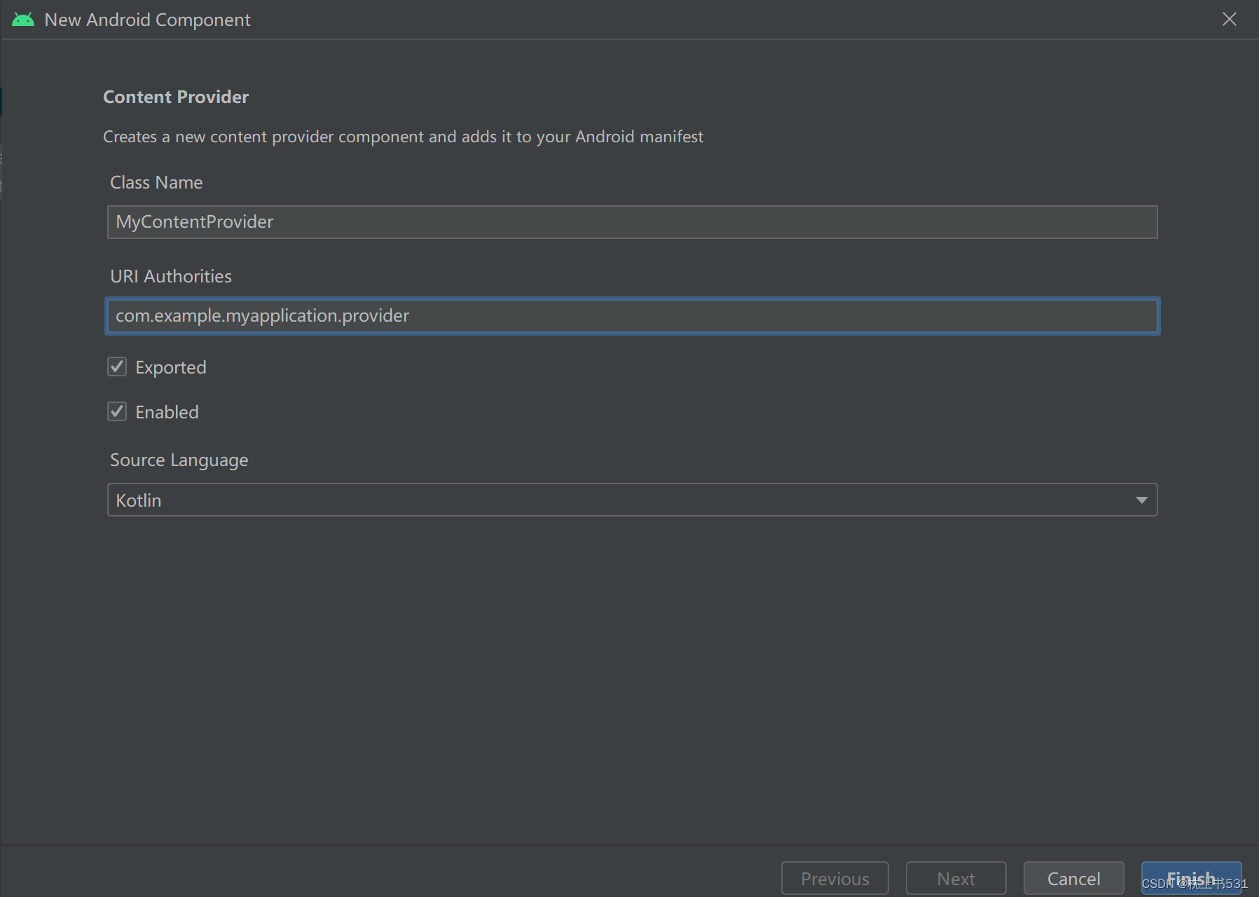 点击finish,完成创建ContentProvider类,这时你可以在注册代码中看到