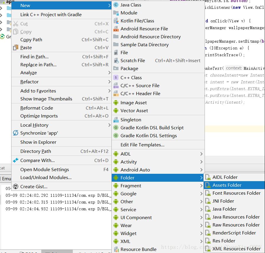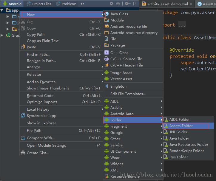 到了Studio下,还是同样的操作,结果却有可能导致打包的apk中assets资源丢失了!!!所以习惯一定要改,Android Studio下assets目录正确的创建姿势是: