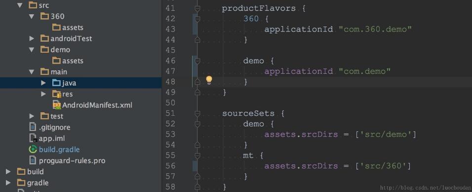 测试发现,这种方式并不奏效——assets目录仍然在main目录下,默认的仍然是一个文件夹(360或者demo)下的内容作为最终打包的资源,并没有根据版本区分开来。