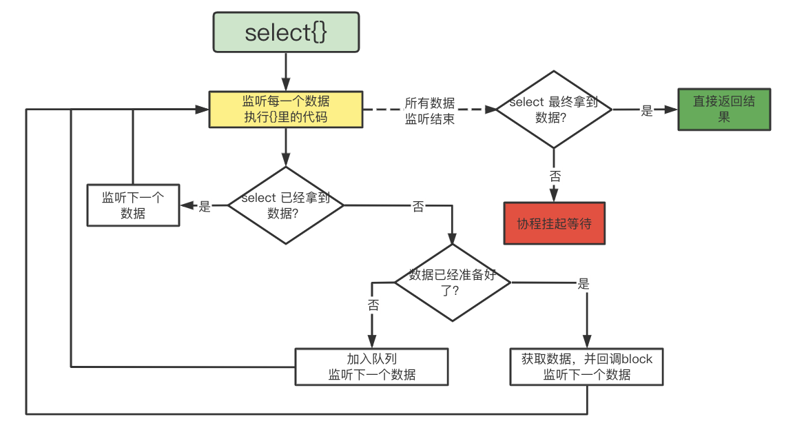 - 没有数据,则select 挂起协程并等待直到其它协程数据准备完成后再次恢复select 所在的协程。