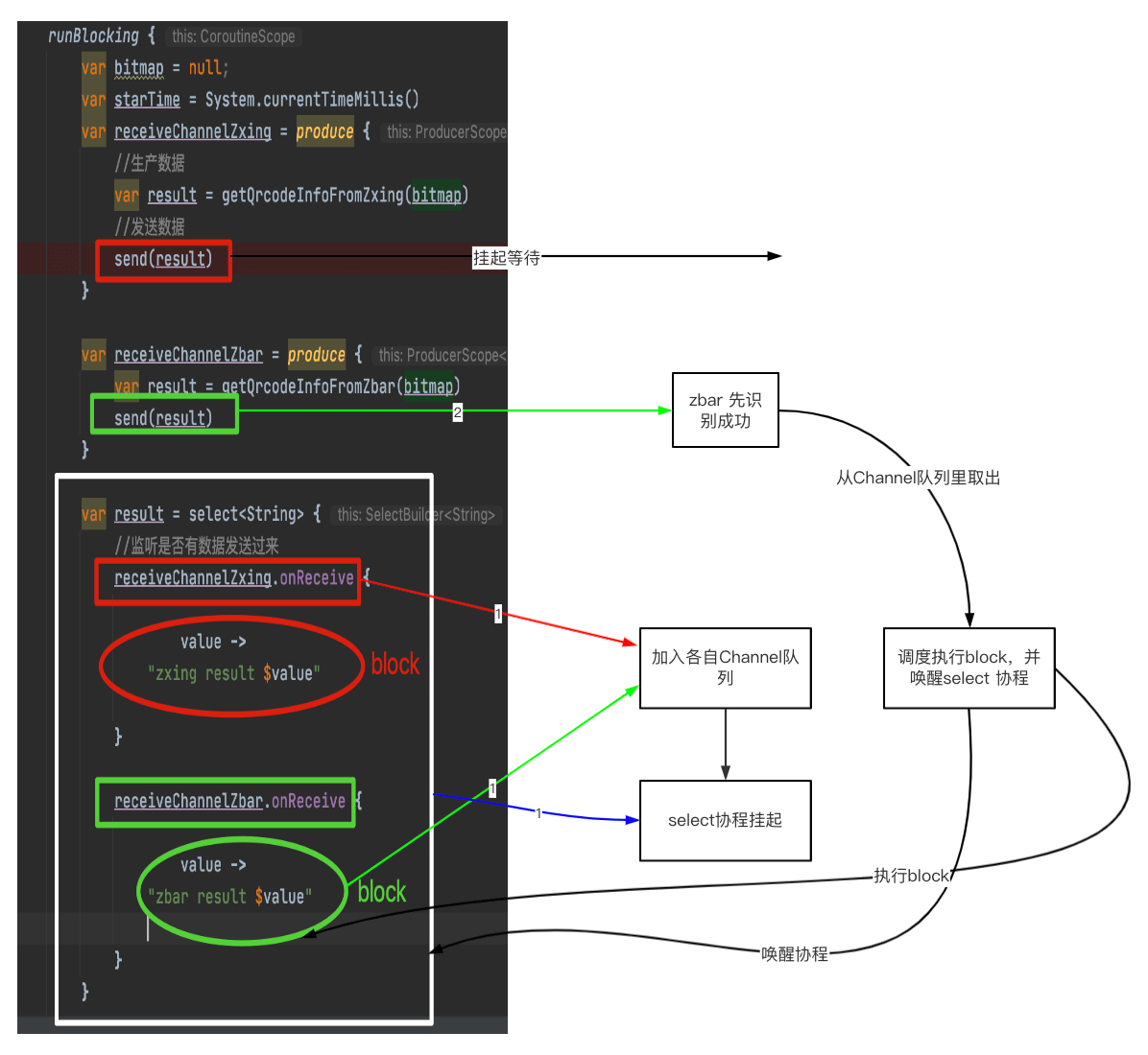 fun testSelect4() { runBlocking { var bitmap = null; var starTime = System.currentTimeMillis() var receiveChannelZxing = produce { //生产数据 var result = getQrcodeInfoFromZxing(bitmap) //发送数据 send(result) } var receiveChannelZbar = produce { var result = getQrcodeInfoFromZbar(bitmap) send(result) } var result = select<String> { //监听是否有数据发送过来 receiveChannelZxing.onReceive { value->"zxing result $value" } receiveChannelZbar.onReceive { value->"zbar result $value" } } println("result from $result useTime:${System.currentTimeMillis() - starTime}") } }