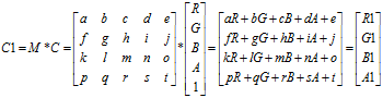 在一张图片中,图像的RGBA(红色、绿色、蓝色、透明度)值决定了该图片所呈现出来的颜色效果。而图像的RGBA值则存储在一个5*1的颜色分量矩阵C中,由颜色分量矩阵C可以控制图像的颜色效果。颜色分量矩阵C如下所示: