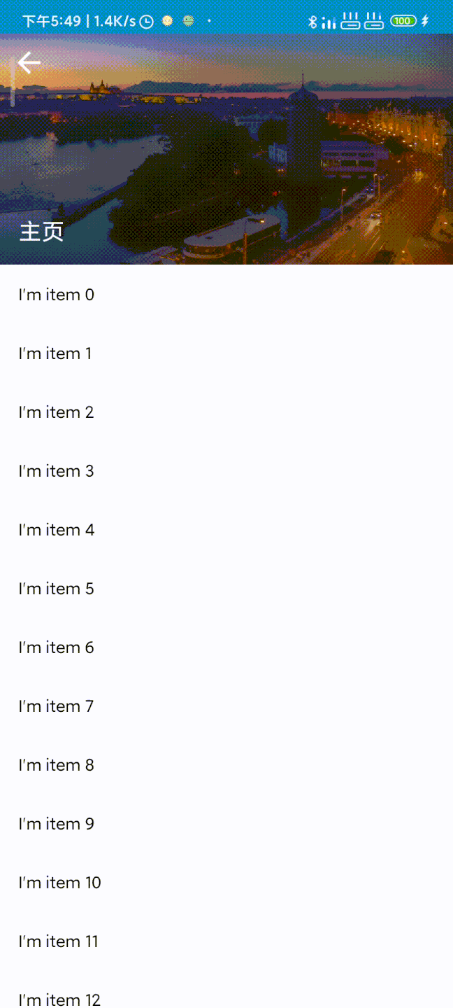 //整体布局实现 Box(modifier = Modifier .height(scrollableAppBarHeight) //scrollableAppBarHeight 为高度参数,为外部获取 .fillMaxWidth() ) { Image(painter = painterResource(id = backgroundImageId), contentDescription = "background", contentScale = ContentScale.FillBounds) // 自定义应用栏 Row( modifier = modifier .height(toolBarHeight) //设置高度为toolBarHeight .fillMaxWidth(), verticalAlignment = Alignment.CenterVertically //设置垂直方向为居中对齐 ) { // 导航图标 Box(modifier = Modifier.size(navigationIconSize),contentAlignment = Alignment.Center) { navigationIcon() } } // title定义 Box( modifier = Modifier .height(toolBarHeight) //和ToolBar同高 .fillMaxWidth() .align(Alignment.BottomStart), contentAlignment = Alignment.CenterStart ) { Text(text = title, color = Color.White, modifier = Modifier.padding(start = 20.dp).matchParentSize(), // 使用 matchParentSize 修饰符保证不影响父 Box尺寸 fontSize = 20.sp ) } }