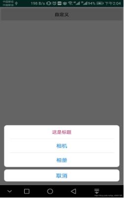 public class MainActivity extends AppCompatActivity implements View.OnClickListener { private Button mDialogCustom; private ButtomMenuDialog dialog; @Override protected void onCreate(Bundle savedInstanceState) { super.onCreate(savedInstanceState); setContentView(R.layout.activity_main); initView(); } private void initView() { mDialogCustom = (Button) findViewById(R.id.custom_dialog); mDialogCustom.setOnClickListener(this); } @Override public void onClick(View v) { switch (v.getId()) { case R.id.custom_dialog: ButtomMenuDialog.Builder builder = new ButtomMenuDialog.Builder(this); //添加条目,可多个 builder.addMenu("相机", new View.OnClickListener() { @Override public void onClick(View view) { dialog.cancel(); Toast.makeText(MainActivity.this, "相机", Toast.LENGTH_SHORT).show(); } }).addMenu("相册", new View.OnClickListener() { @Override public void onClick(View view) { dialog.cancel(); Toast.makeText(MainActivity.this, "相册", Toast.LENGTH_SHORT).show(); } }); //下面这些设置都可不写 builder.setTitle("这是标题");//添加标题 builder.setCanCancel(false);//点击阴影时是否取消dialog,true为取消 builder.setShadow(true);//是否设置阴影背景,true为有阴影 builder.setCancelText("取消");//设置最下面取消的文本内容 //设置点击取消时的事件 builder.setCancelListener(new View.OnClickListener() { @Override public void onClick(View view) { dialog.cancel(); Toast.makeText(MainActivity.this, "取消", Toast.LENGTH_SHORT).show(); } }); dialog = builder.create(); dialog.show(); break; default: break; } } }