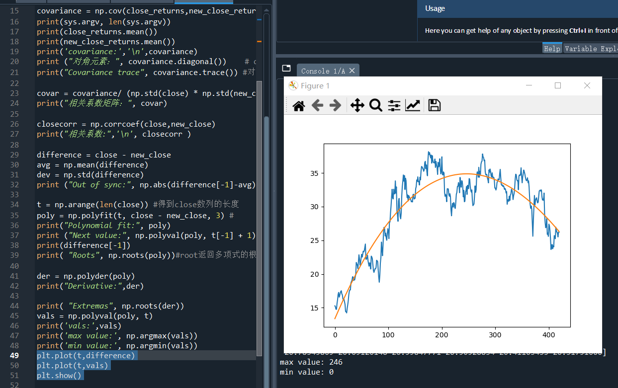 import numpy as np from datetime import datetime import matplotlib.pyplot as plt def datestr2num(s): #定义一个函数 return datetime.strptime(s.decode('ascii'),"%Y-%m-%d").date().weekday() close=np.loadtxt('data036.csv',delimiter=',', usecols=(5,),converters={1:datestr2num},unpack=True) #导入data036.csv数据 new_close=np.loadtxt('data999.csv',delimiter=',', usecols=(5,),converters={1:datestr2num},unpack=True)#导入data999.csv数据 covariance = np.cov(close,new_close) #使用numpy.cov() 函数计算两个数列的协方差矩阵 print(close.mean()) #求close的平均值 print(new_close.mean())#求new_close的平均值 print('covariance:','\n',covariance)