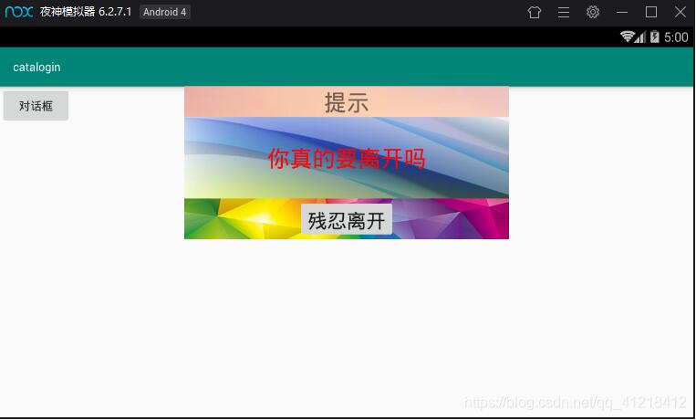 <?xml version="1.0" encoding="utf-8"?> <LinearLayout xmlns:android="http://schemas.android.com/apk/res/android" android:layout_width="match_parent" android:layout_height="match_parent" android:orientation="vertical"> <TextView android:layout_width="match_parent" android:layout_height="wrap_content" android:gravity="center" android:text="提示" android:background="@drawable/click" android:textSize="28sp"/> <TextView android:layout_width="match_parent" android:layout_height="100dp" android:gravity="center" android:text="你真的要离开吗" android:textColor="#ff0400" android:background="@drawable/background" android:textSize="28sp"/> <LinearLayout android:layout_width="wrap_content" android:layout_height="50sp" android:orientation="horizontal" android:background="@drawable/bb" android:gravity="center"> <Button android:id="@ id/but" android:layout_width="wrap_content" android:layout_height="wrap_content" android:text="残忍离开" android:textSize="24sp"/> </LinearLayout> </LinearLayout>