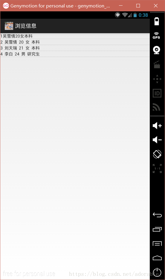 package com.example.system; import android.app.AlertDialog; import android.app.ListActivity; import android.content.DialogInterface; import android.database.Cursor; import android.os.Bundle; import android.view.View; import android.widget.AdapterView; import android.widget.AdapterView.OnItemClickListener; import android.widget.ListView; import android.widget.SimpleCursorAdapter; public class QueryActivity extends ListActivity{ private ListView listview=null; @Override public void onCreate(Bundle savedInstanceState){ super.onCreate(savedInstanceState); this.setTitle("浏览信息"); listview=getListView(); final DBHelper helper=new DBHelper(this); Cursor c=helper.query(); String[] from={"_id","name","age","sex","edu"}; int[] to={R.id.text0,R.id.text1,R.id.text2,R.id.text3,R.id.text4}; SimpleCursorAdapter adapter=new SimpleCursorAdapter(this, R.layout.activity_query, c, from, to); listview.setAdapter(adapter); } }
