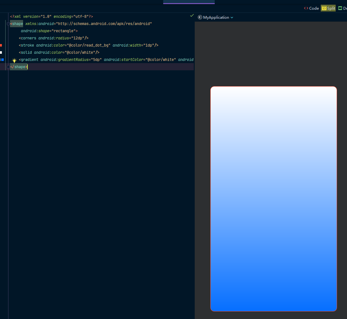 <?xml version="1.0" encoding="utf-8"?> <shape xmlns:android="http://schemas.android.com/apk/res/android" android:shape="rectangle"> <corners android:radius="12dp"/> <stroke android:color="@color/read_dot_bg" android:width="1dp"/> <solid android:color="@color/white"/> <gradient android:gradientRadius="5dp" android:startColor="@color/white" android:endColor="@color/font_blue"/> </shape>